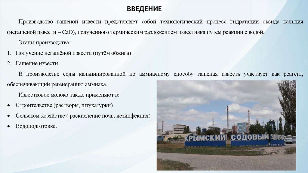 ВВЕДЕНИЕПроизводство гашеной извести представляет собой технологический процесс гидратации оксида кальция
