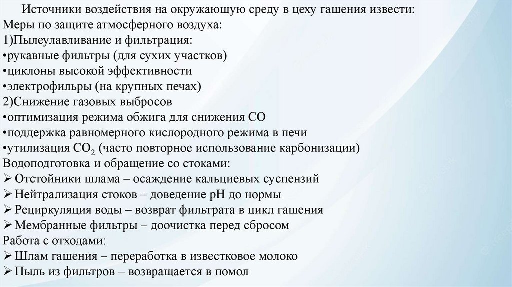 Источники воздействия на окружающую среду в цеху гашения извести:Меры по защите атмосферного воздуха: