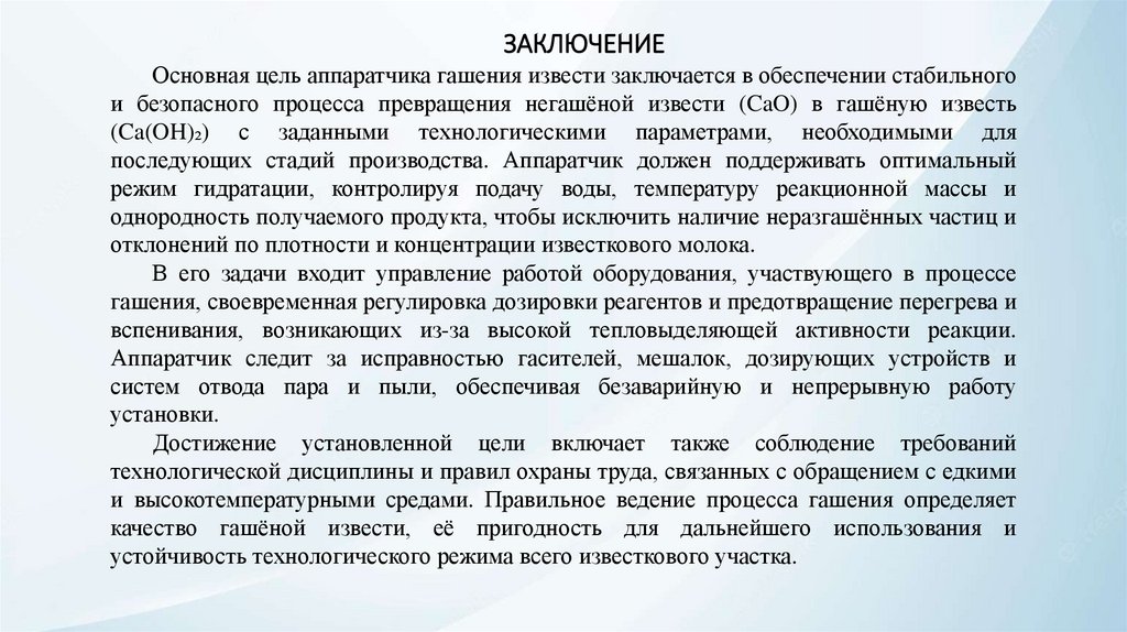 ЗАКЛЮЧЕНИЕОсновная цель аппаратчика гашения извести заключается в обеспечении стабильного