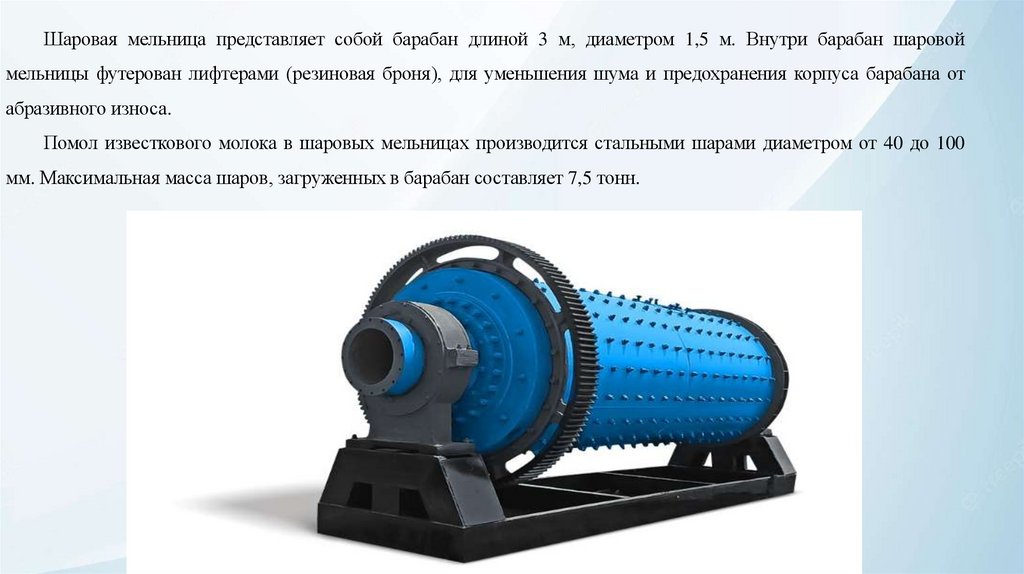 Помол известкового молока в шаровых мельницах производится стальными шарами диаметром от 40 до 100
