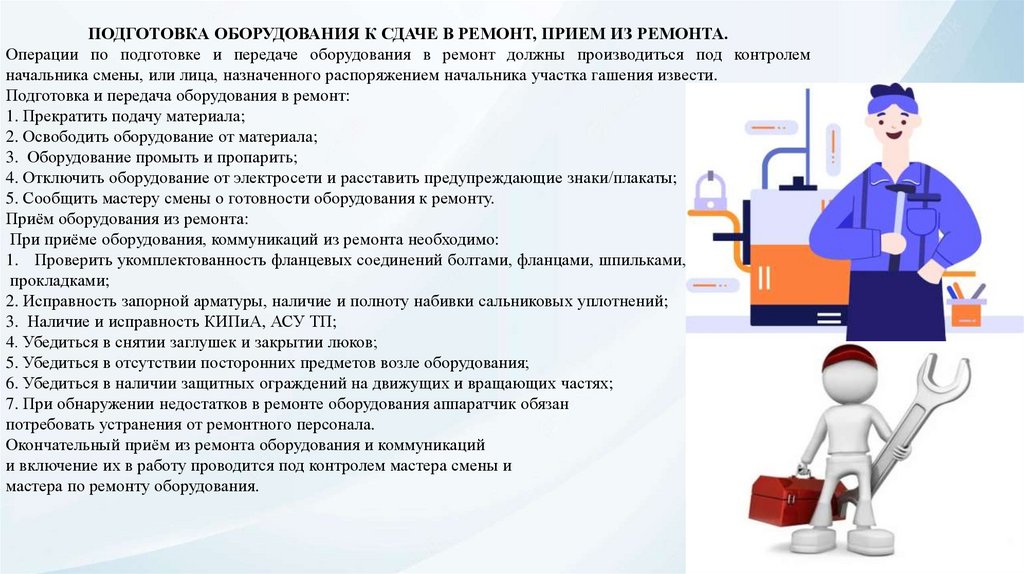 в работе оборудования. На оперативке доложить мастеру смены о нарушениях и неполадках. Принимать смену, после