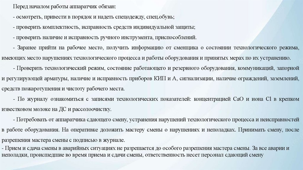 - Потребовать от аппаратчика сдающего смену, устранения нарушений технологического процесса и неисправностей