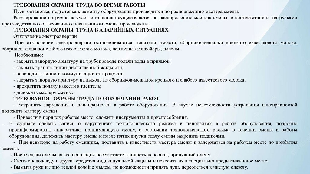 ТРЕБОВАНИЯ ОХРАНЫ ТРУДА ВО ВРЕМЯ РАБОТЫПуск, остановка, подготовка к ремонту оборудования производится по распоряжению мастера смены.