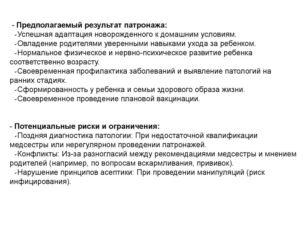 - Предполагаемый результат патронажа:Успешная адаптация новорожденного к домашним условиям.