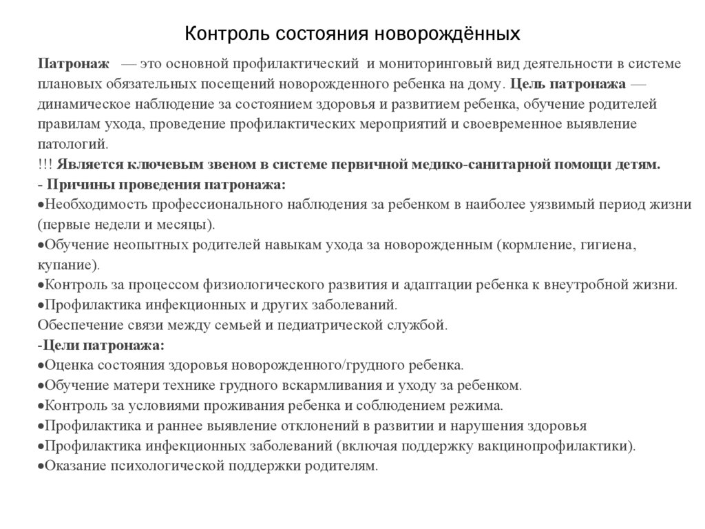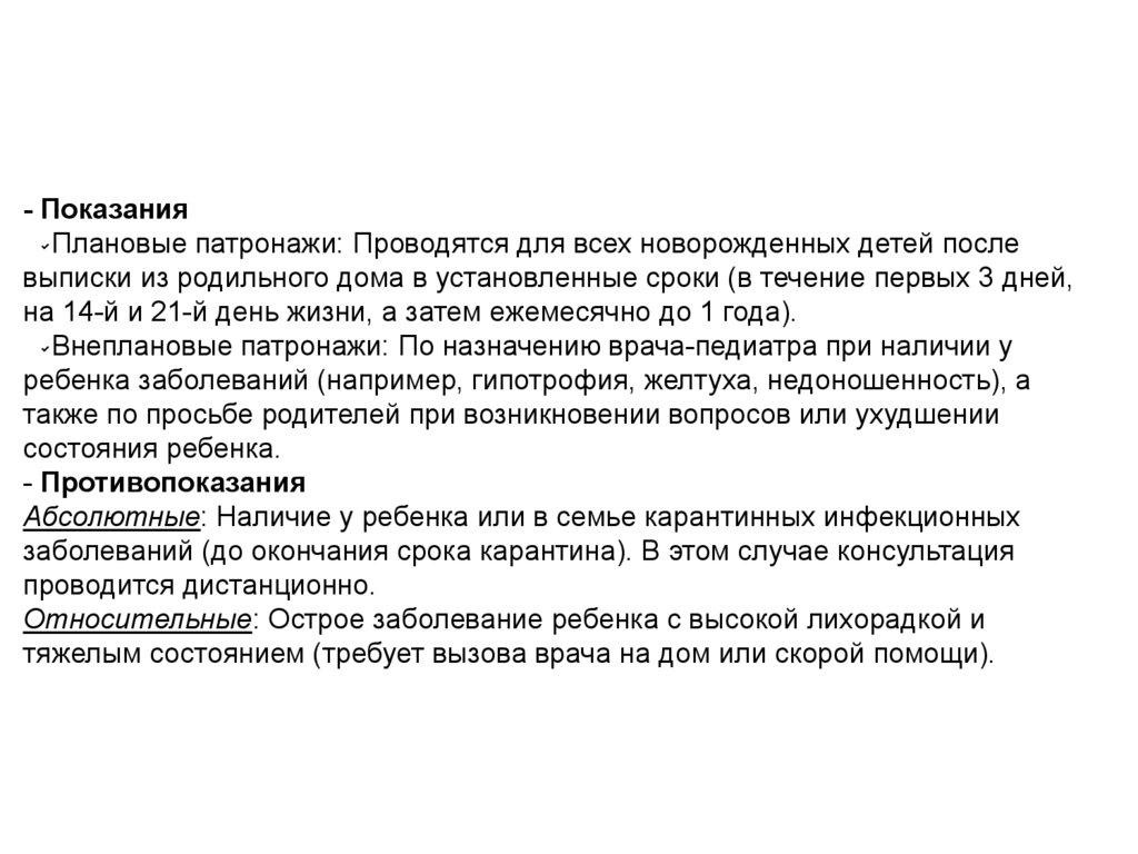 - ПоказанияПлановые патронажи: Проводятся для всех новорожденных детей после