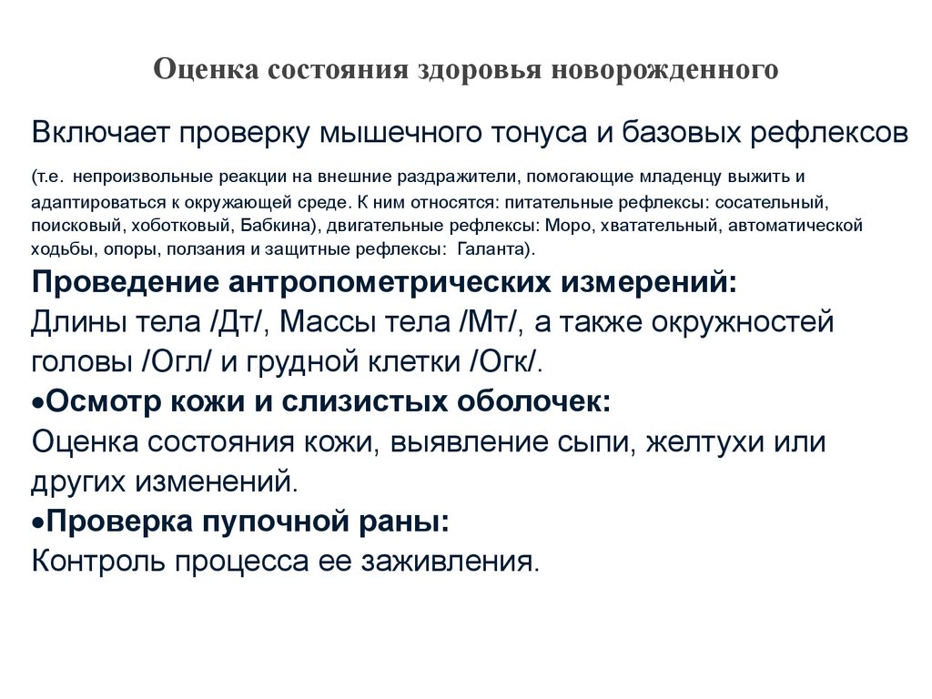 Оценка состояния здоровья новорожденногоВключает проверку мышечного тонуса и базовых рефлексов