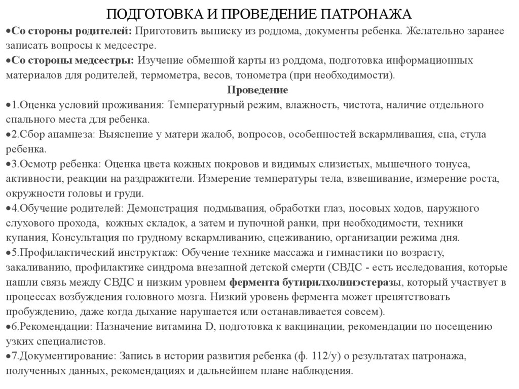 ПОДГОТОВКА И ПРОВЕДЕНИЕ ПАТРОНАЖАСо стороны родителей: Приготовить выписку из роддома, документы ребенка. Желательно заранее