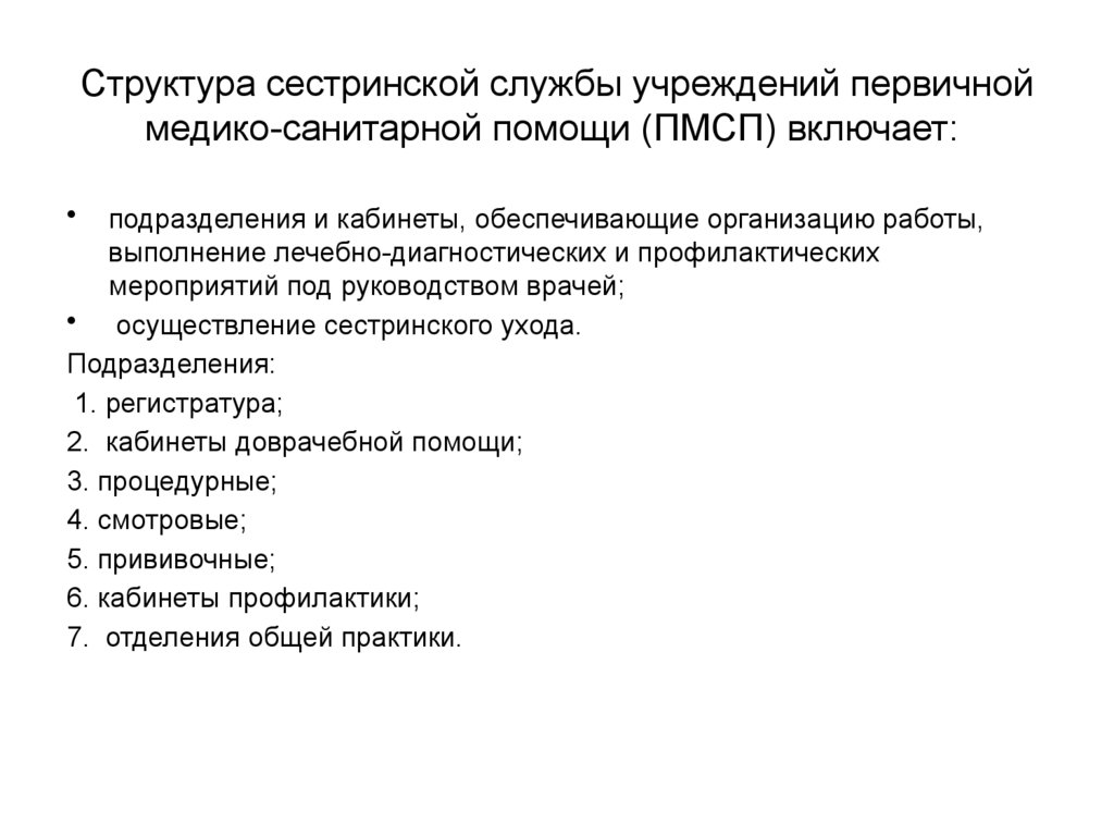 Структура сестринской службы учреждений первичноймедико-санитарной помощи (ПМСП) включает: