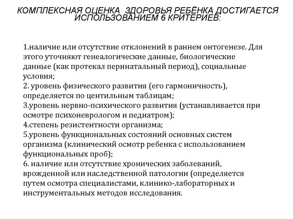КОМПЛЕКСНАЯ ОЦЕНКА ЗДОРОВЬЯ РЕБЁНКА ДОСТИГАЕТСЯИСПОЛЬЗОВАНИЕМ 6 КРИТЕРИЕВ:
