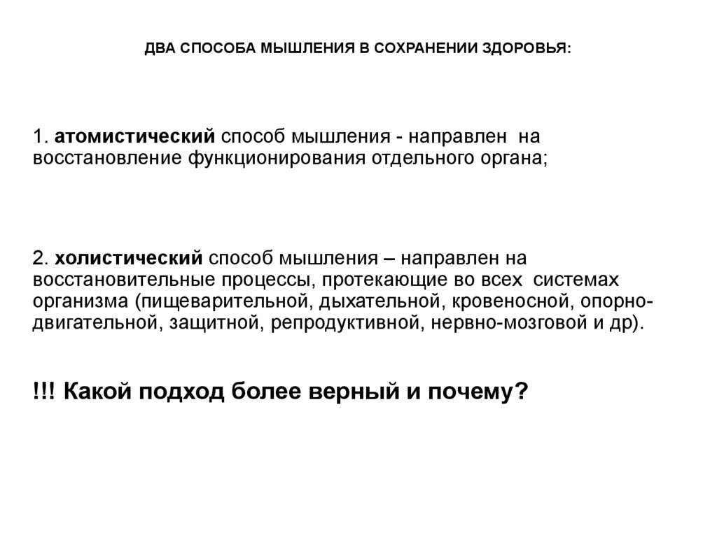 ДВА СПОСОБА МЫШЛЕНИЯ В СОХРАНЕНИИ ЗДОРОВЬЯ:1. атомистический способ мышления - направлен на