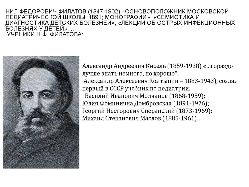НИЛ ФЕДОРОВИЧ ФИЛАТОВ (1847-1902) –ОСНОВОПОЛОЖНИК МОСКОВСКОЙПЕДИАТРИЧЕСКОЙ ШКОЛЫ, 1891; МОНОГРАФИИ - «СЕМИОТИКА И