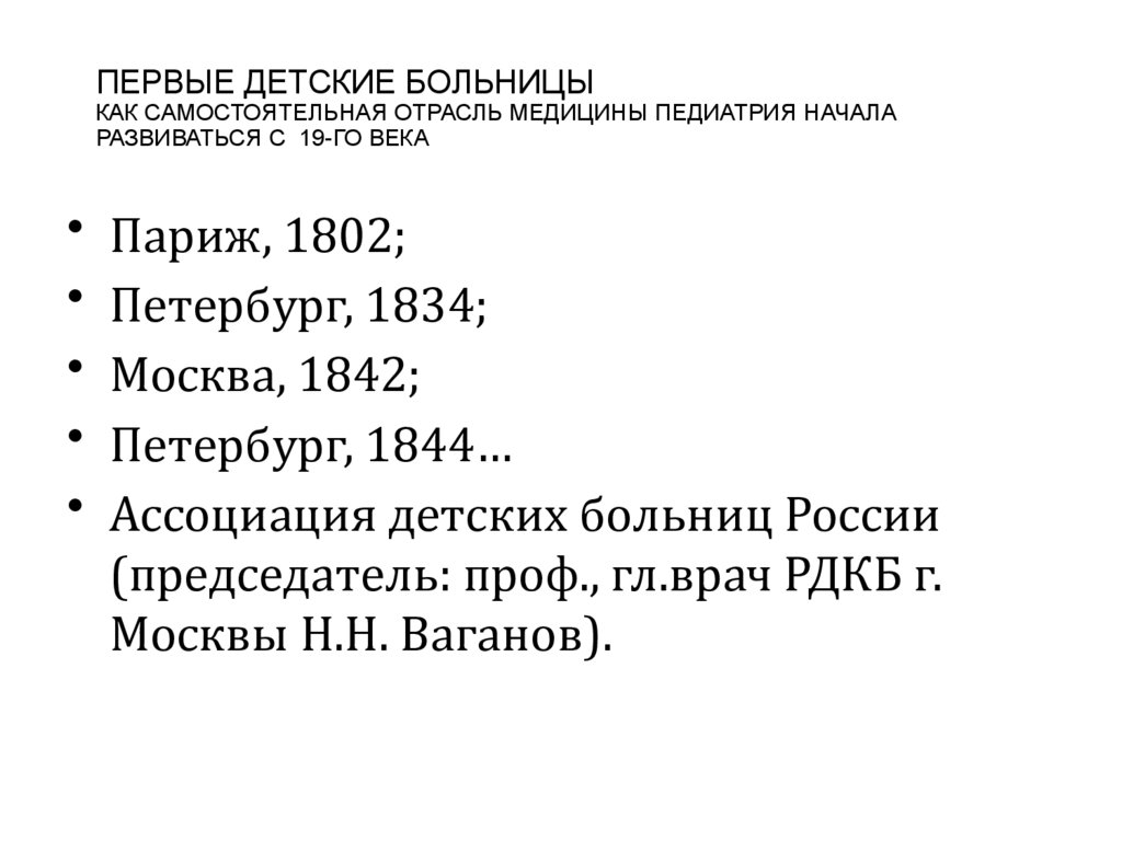 ПЕРВЫЕ ДЕТСКИЕ БОЛЬНИЦЫКАК САМОСТОЯТЕЛЬНАЯ ОТРАСЛЬ МЕДИЦИНЫ ПЕДИАТРИЯ НАЧАЛА