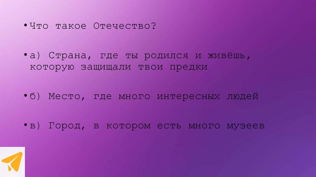 • Что такое Отечество?• а) Страна, где ты родился и живёшь,