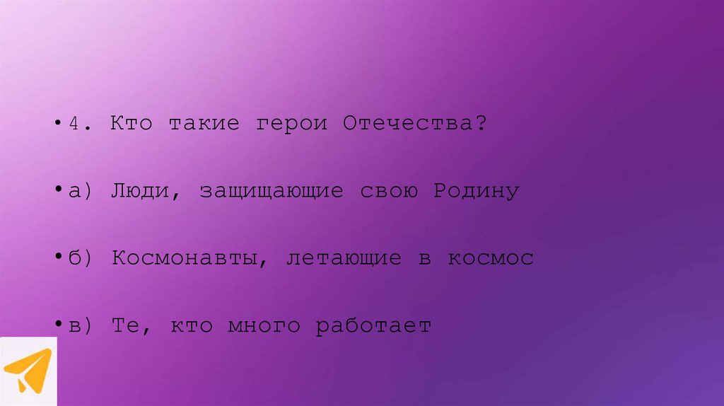 • 4. Кто такие герои Отечества?• а) Люди, защищающие свою Родину