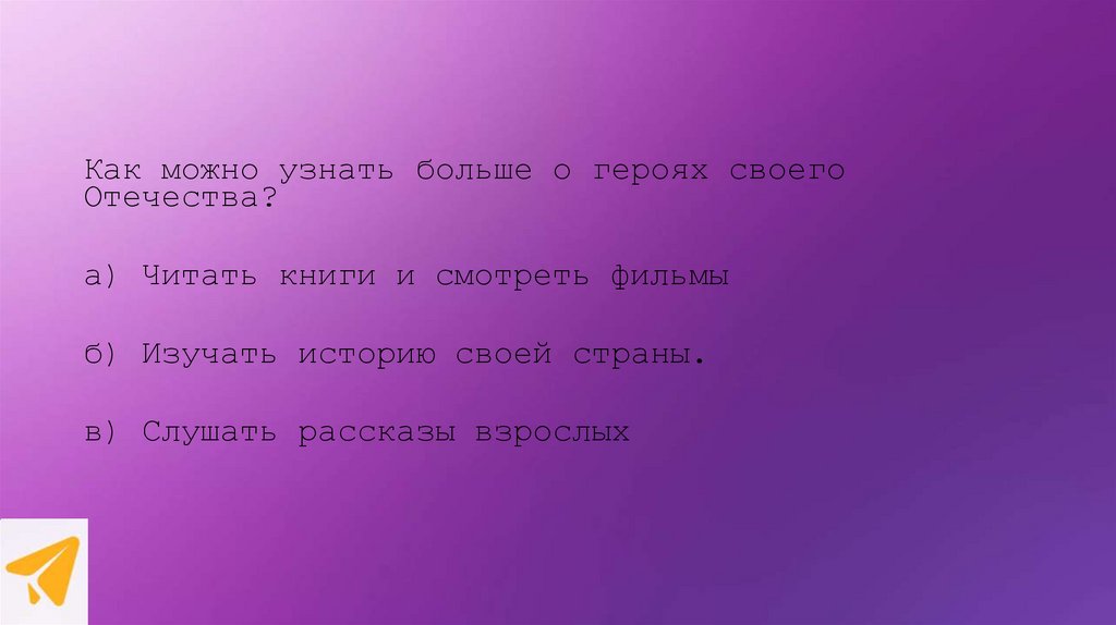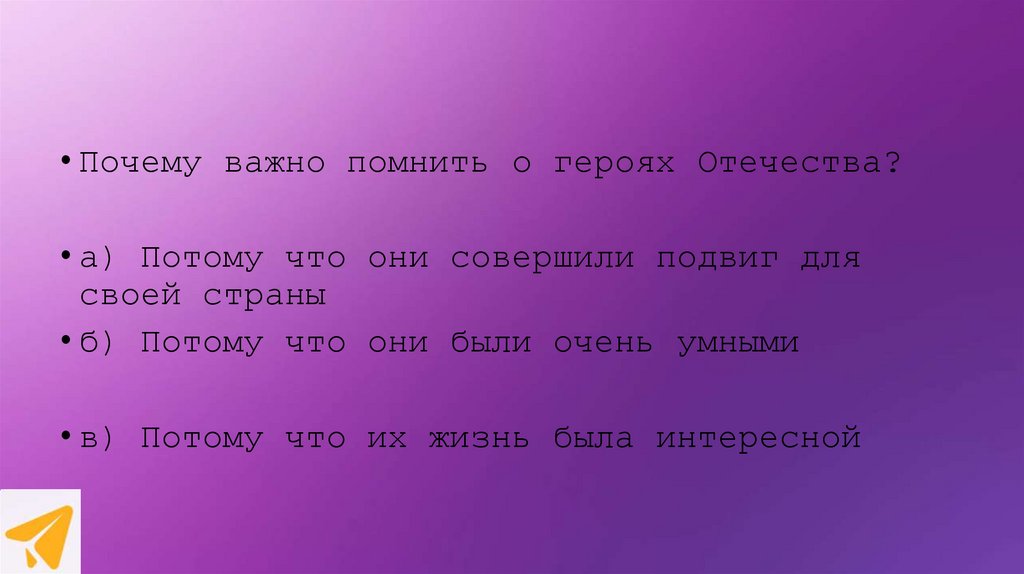 • Почему важно помнить о героях Отечества?• а) Потому что они совершили подвиг для
