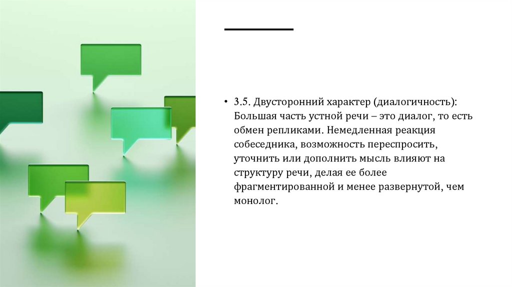 • 3.5. Двусторонний характер (диалогичность):Большая часть устной речи – это диалог, то есть