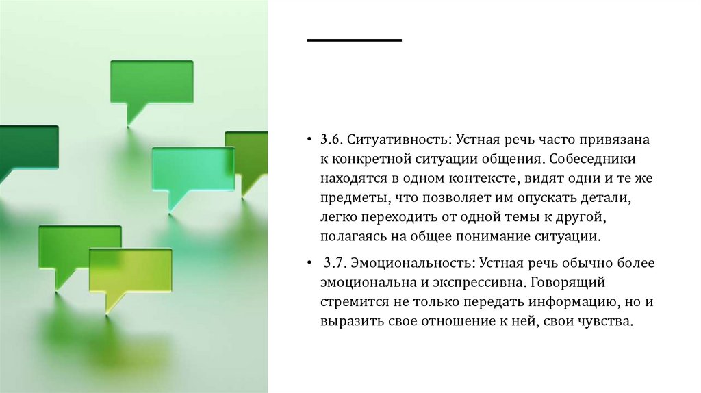 • 3.6. Ситуативность: Устная речь часто привязанак конкретной ситуации общения. Собеседники