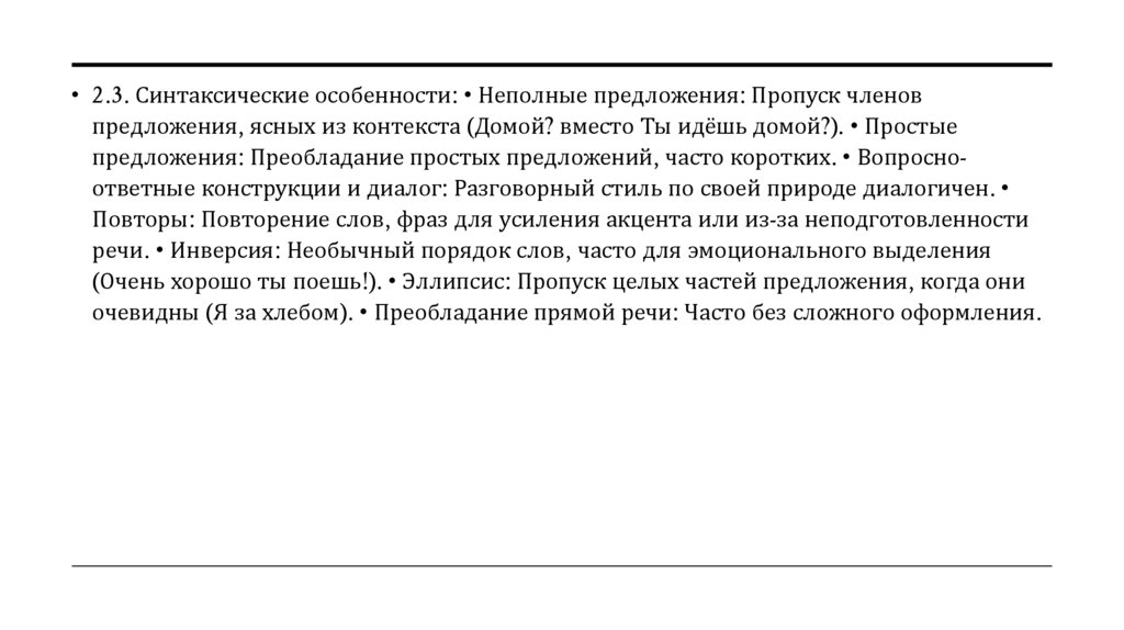 • 2.3. Синтаксические особенности: • Неполные предложения: Пропуск членовпредложения, ясных из контекста (Домой? вместо Ты идёшь домой?). • Простые