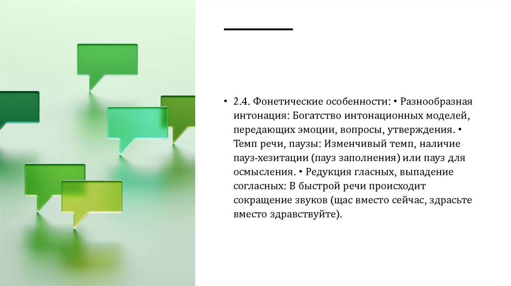 • 2.4. Фонетические особенности: • Разнообразнаяинтонация: Богатство интонационных моделей,