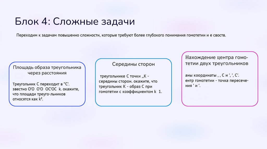Блок 4: Сложные задачиПереходим к задачам повышенной сложности, которые требуют более глубокого понимания гомотетии и её свойств.