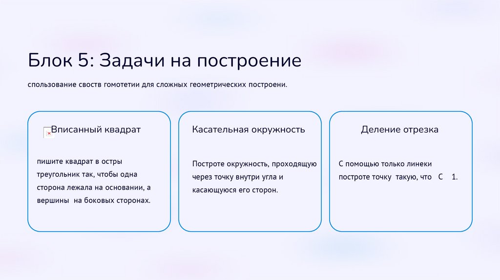 Блок 5: Задачи на построениеИспользование свойств гомотетии для сложных геометрических построений.