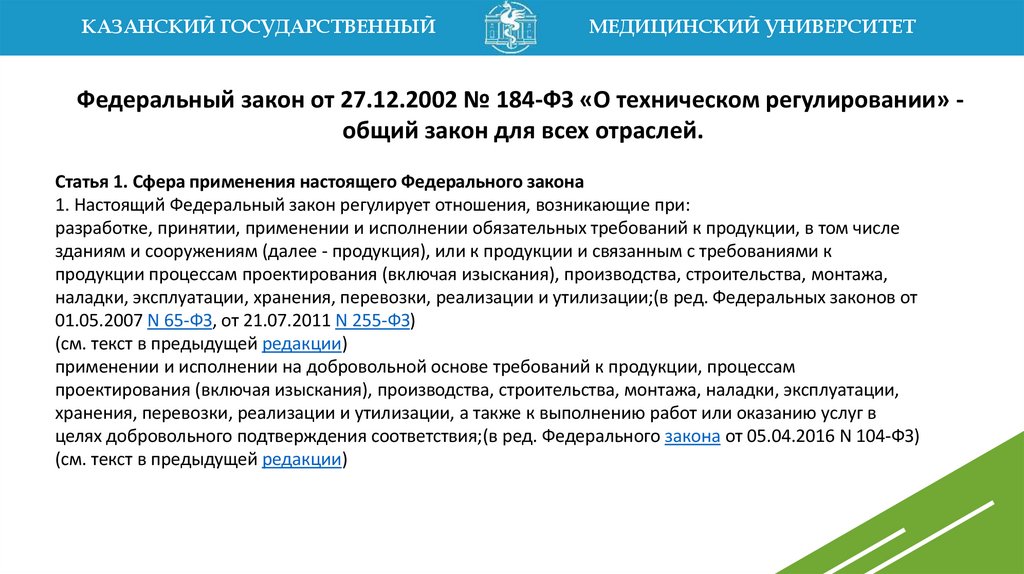 • Федеральный закон от 27.12.2002 № 184-ФЗ «О техническом регулировании» - общий закон для всех отраслей.