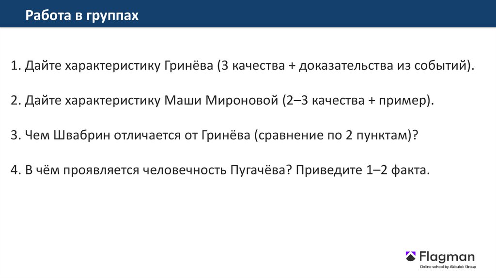 Работа в группах1. Дайте характеристику Гринёва (3 качества + доказательства из событий).