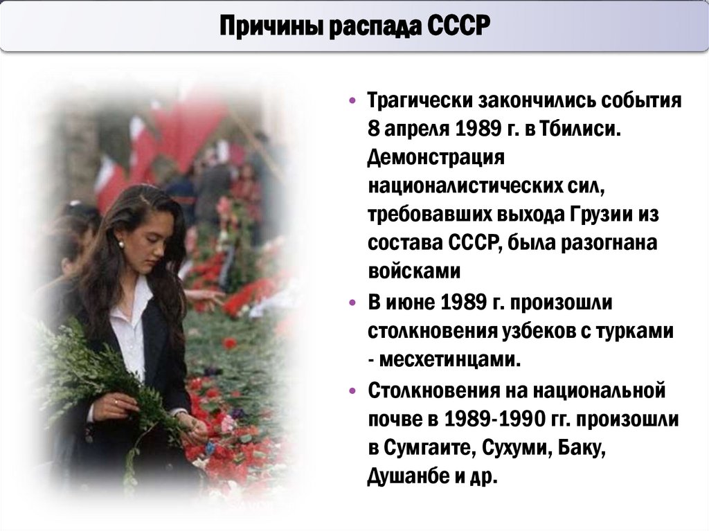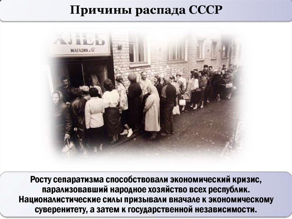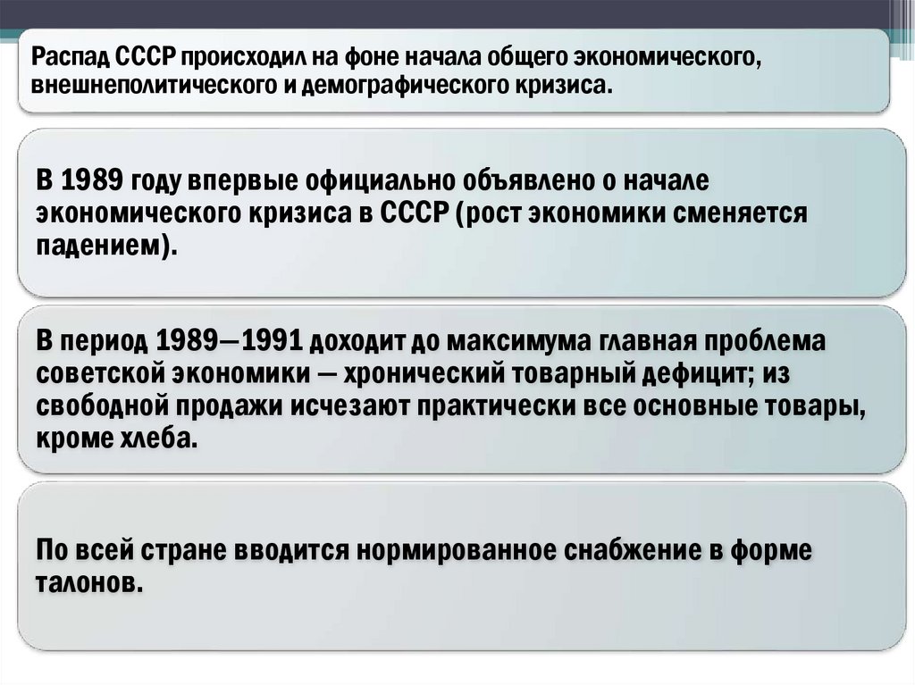 Распад СССР происходил на фоне начала общего экономического,внешнеполитического и демографического кризиса.