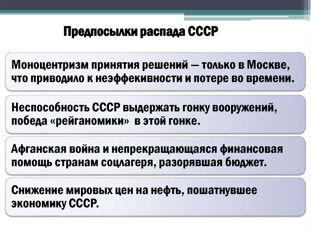 Предпосылки распада СССРМоноцентризм принятия решений — только в Москве,