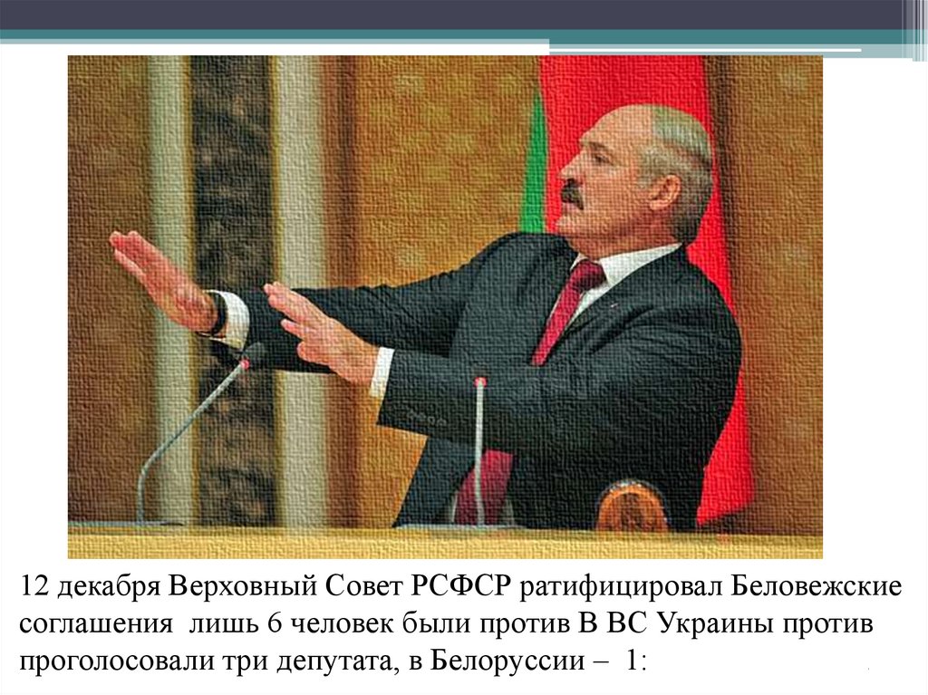 12 декабря Верховный Совет РСФСР ратифицировал Беловежскиесоглашения лишь 6 человек были против В ВС Украины против