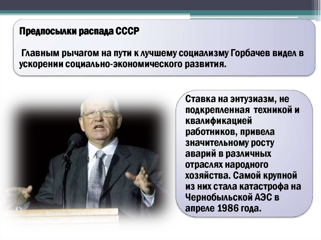 Предпосылки распада СССРГлавным рычагом на пути к лучшему социализму Горбачев видел в