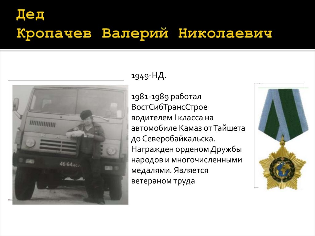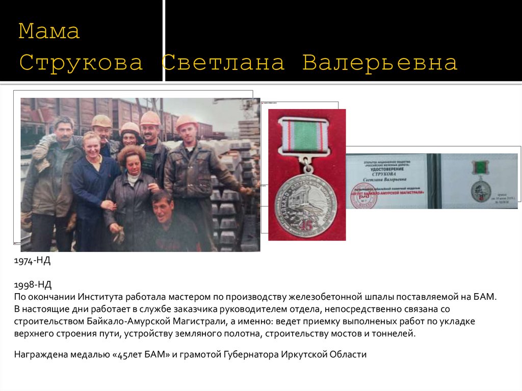 Награждена медалью «45лет БАМ» и грамотой Губернатора Иркутской Области