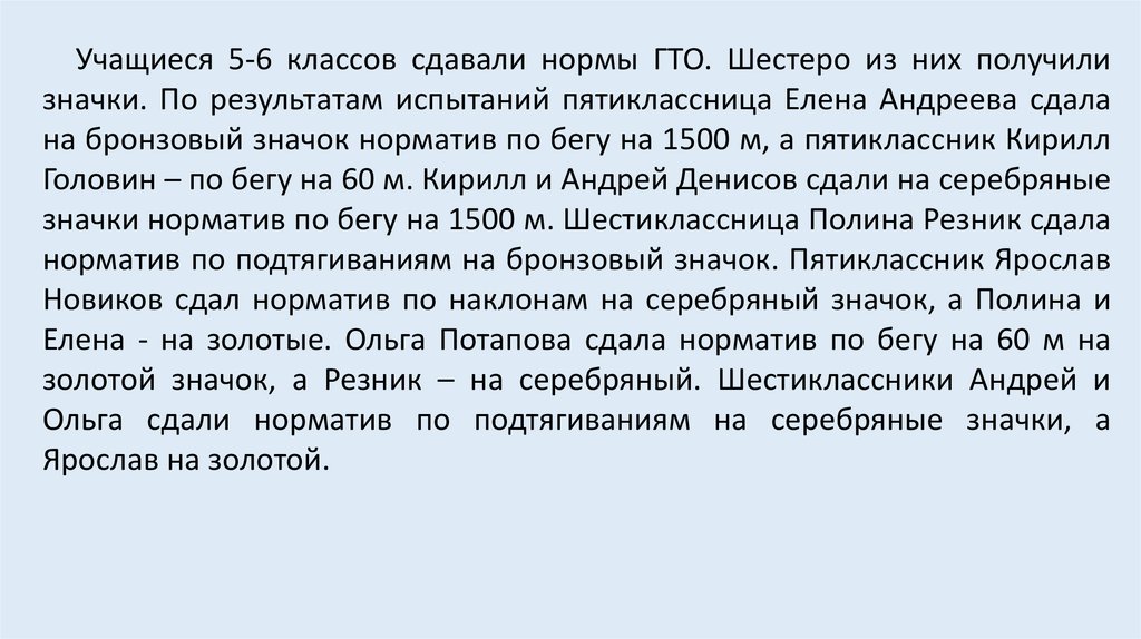 Учащиеся 5-6 классов сдавали нормы ГТО. Шестеро из них получилизначки. По результатам испытаний пятиклассница Елена Андреева сдала