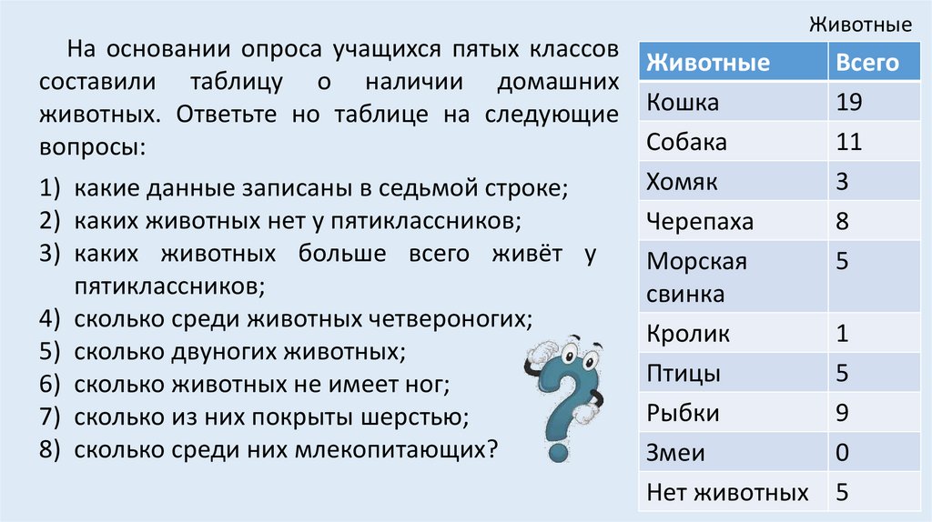 На основании опроса учащихся пятых классовсоставили таблицу о наличии домашних