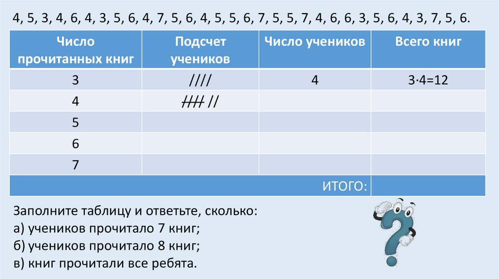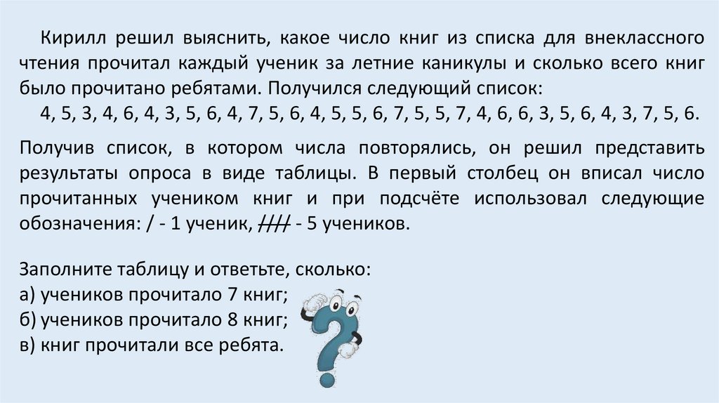 Кирилл решил выяснить, какое число книг из списка для внеклассногочтения прочитал каждый ученик за летние каникулы и сколько всего книг