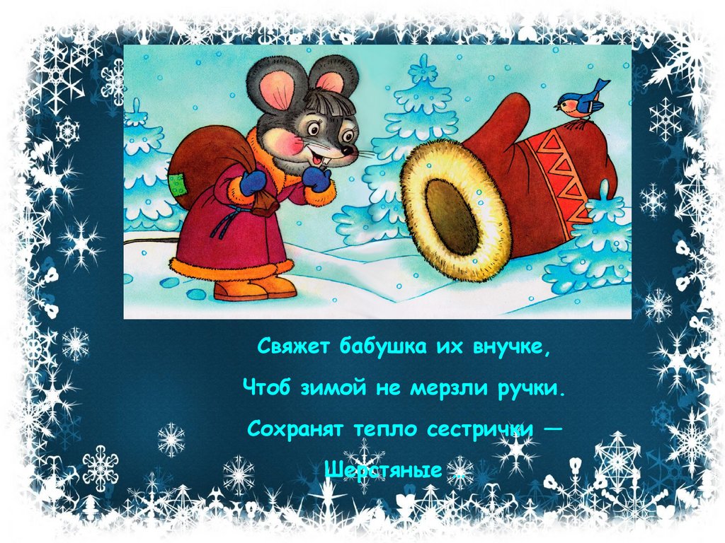 Свяжет бабушка их внучке,Чтоб зимой не мерзли ручки.