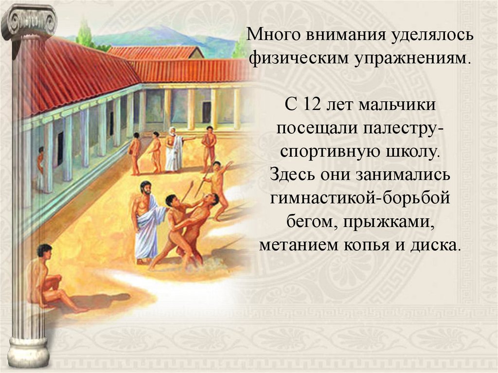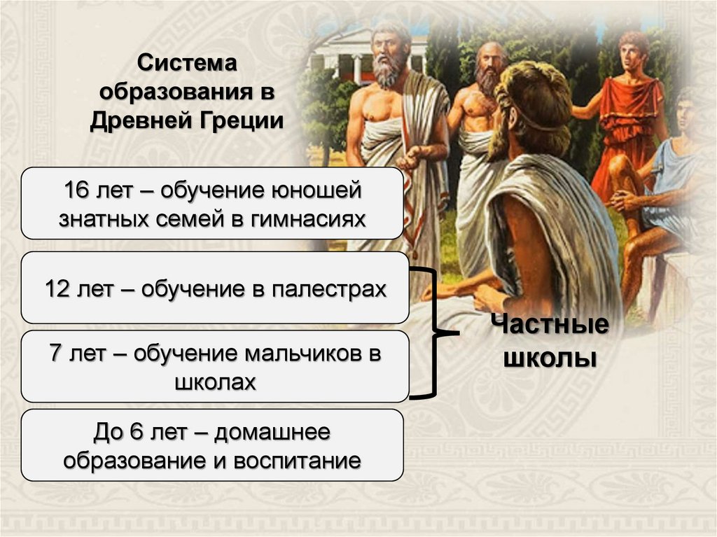 9. С 16 лет мальчики могли продолжить свое образование в гимнасиях, школах риторов и философов. Это могли себе позволить только