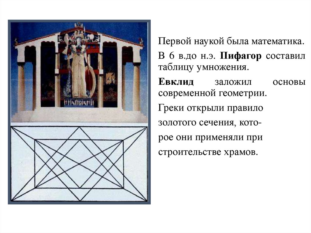 Первой наукой была математика.В 6 в.до н.э. Пифагор составил