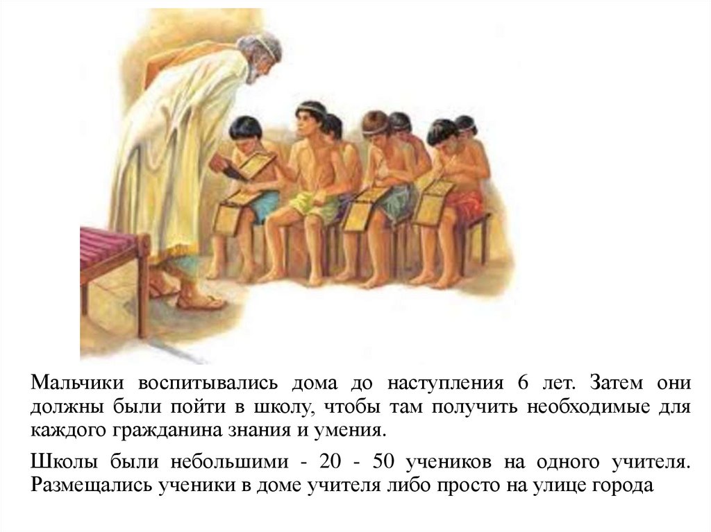 Мальчики воспитывались дома до наступления 6 лет. Затем онидолжны были пойти в школу, чтобы там получить необходимые для