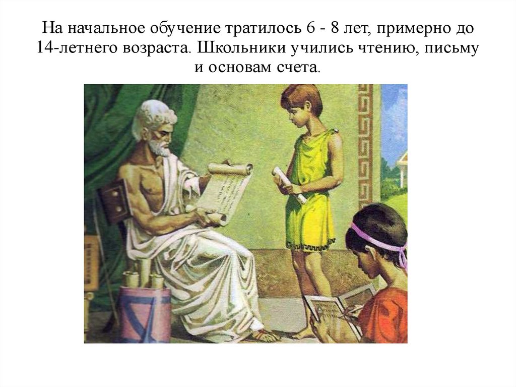 На начальное обучение тратилось 6 - 8 лет, примерно до14-летнего возраста. Школьники учились чтению, письму