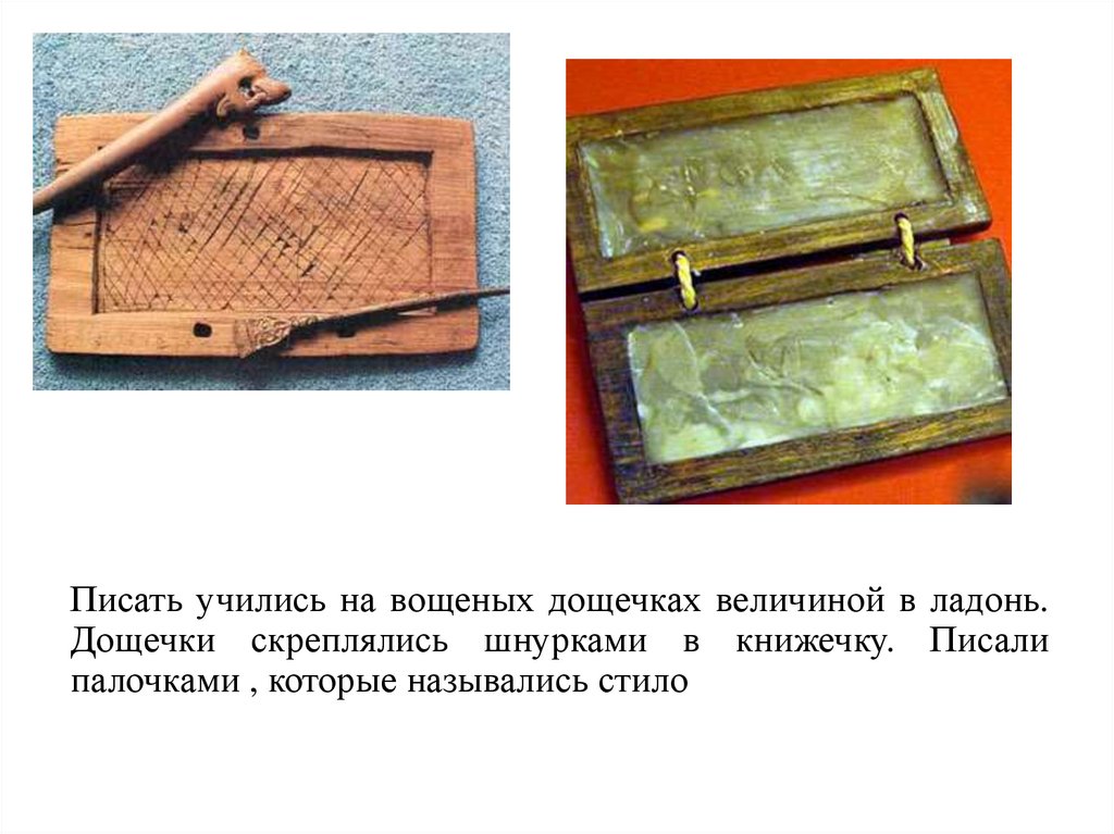 Писать учились на вощеных дощечках величиной в ладонь.Дощечки скреплялись шнурками в книжечку. Писали