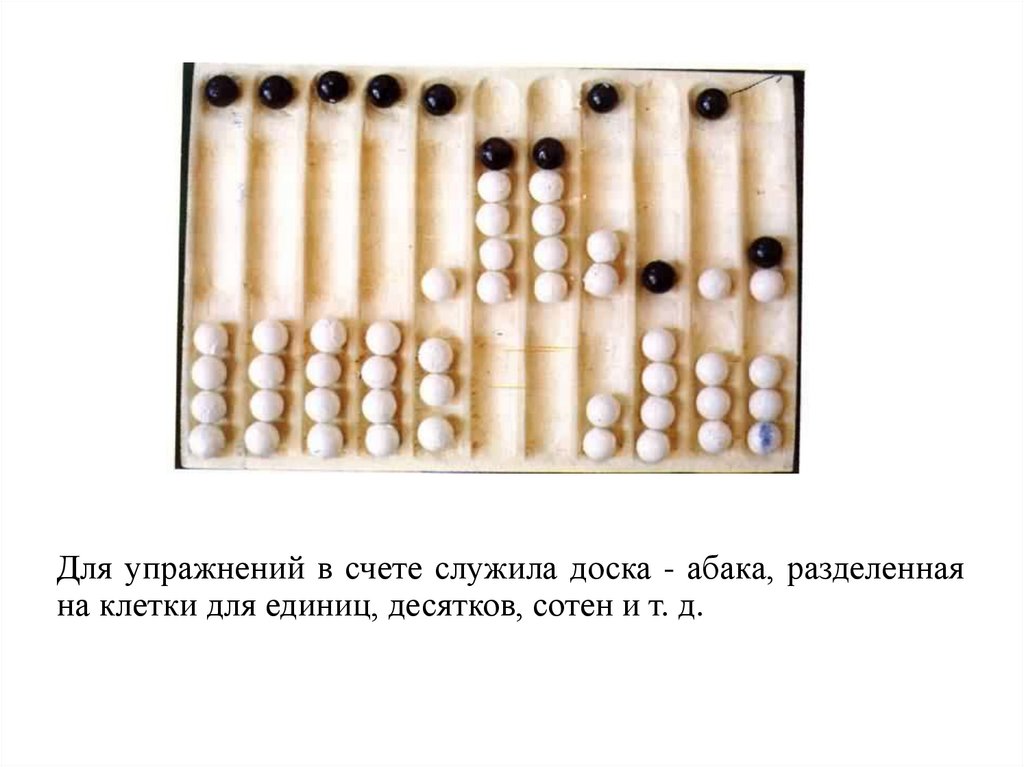 Для упражнений в счете служила доска - абака, разделеннаяна клетки для единиц, десятков, сотен и т. д.