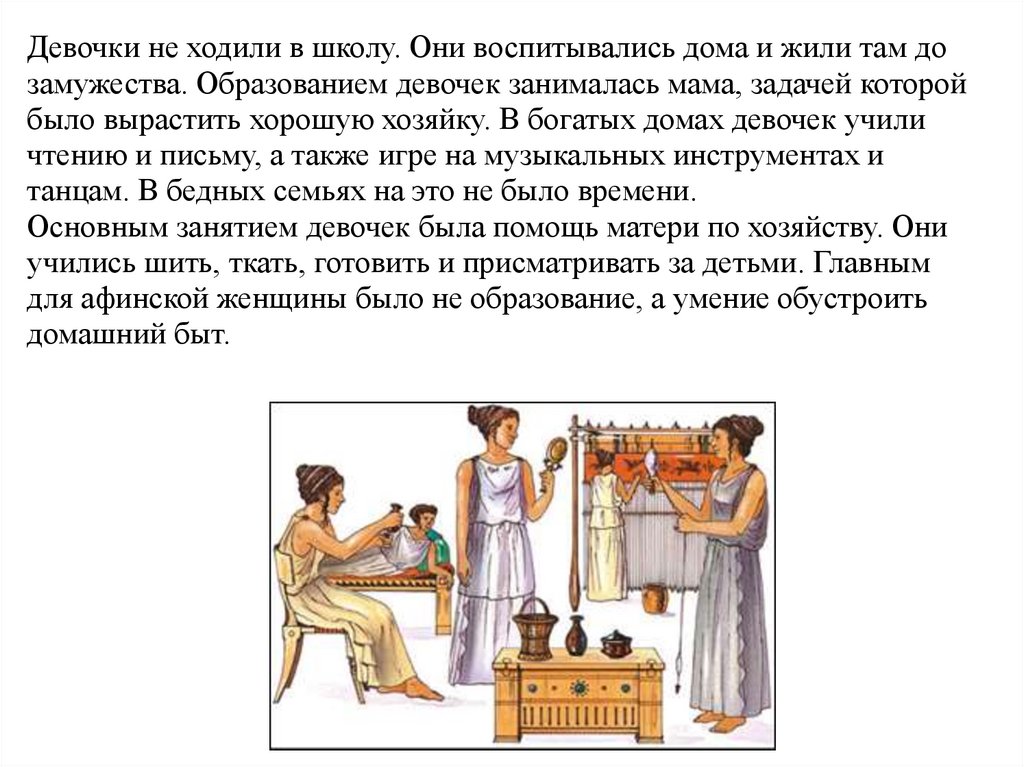 учились шить, ткать, готовить и присматривать за детьми. Главным
