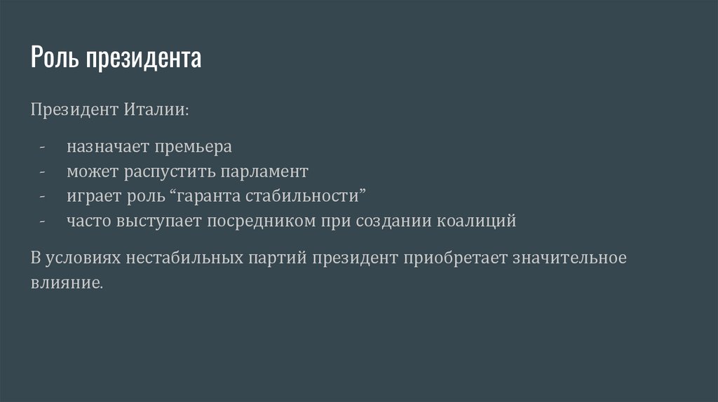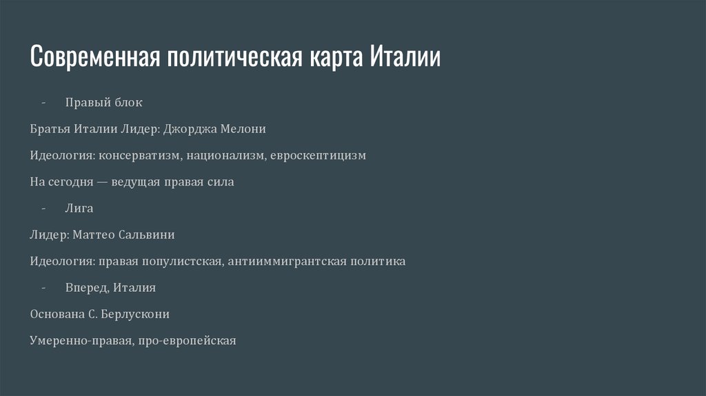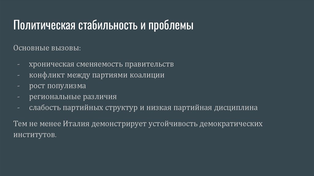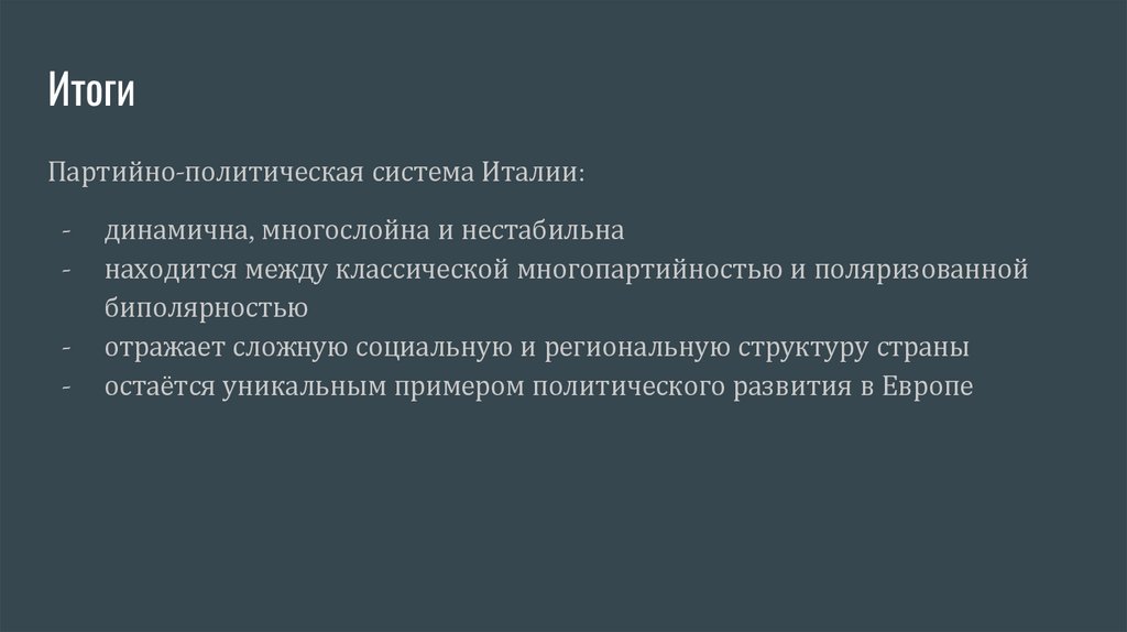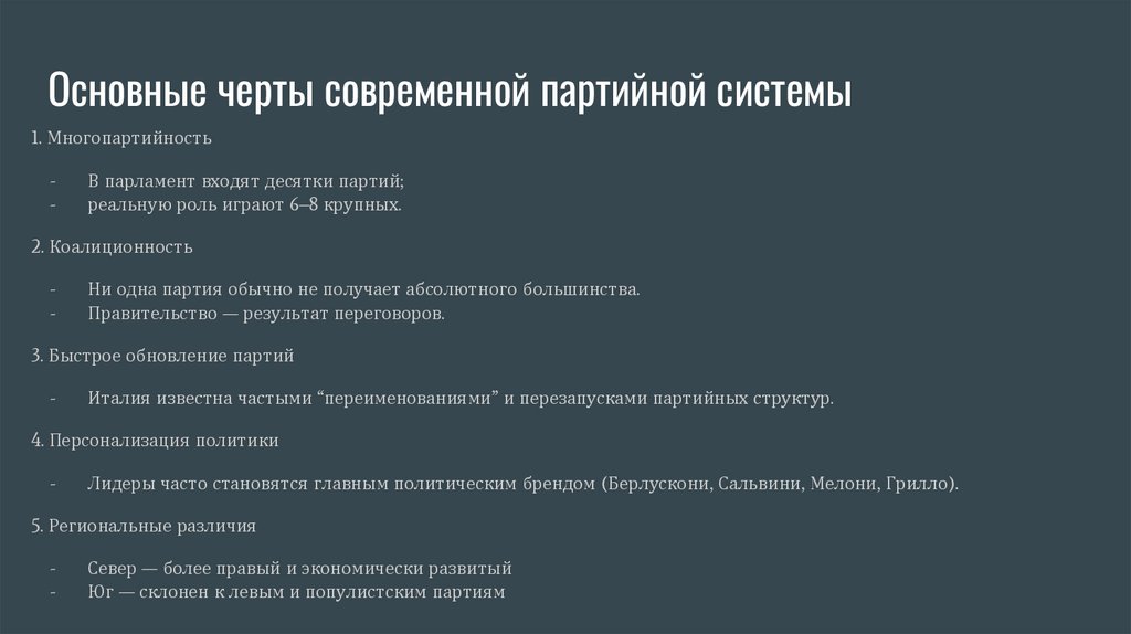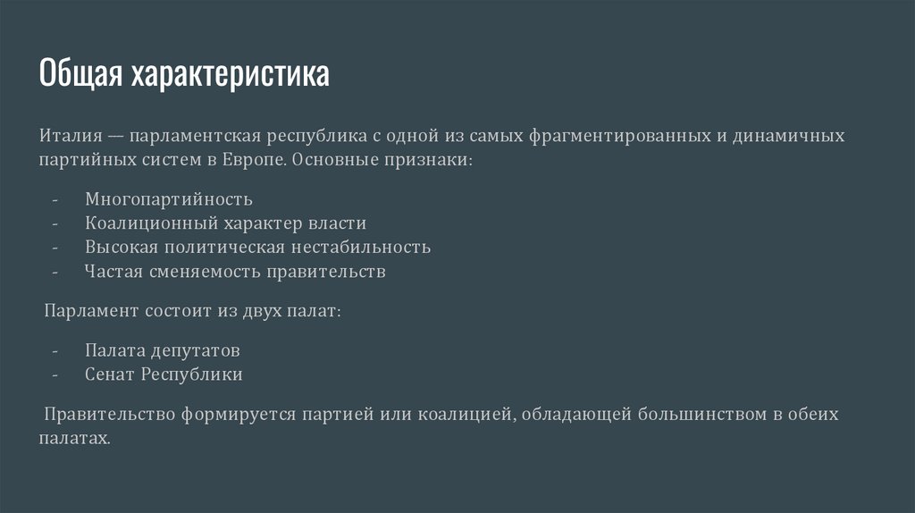 Общая характеристикаИталия — парламентская республика с одной из самых фрагментированных и динамичных