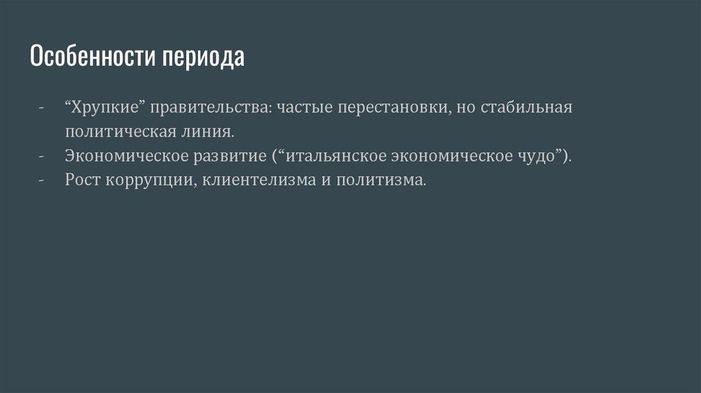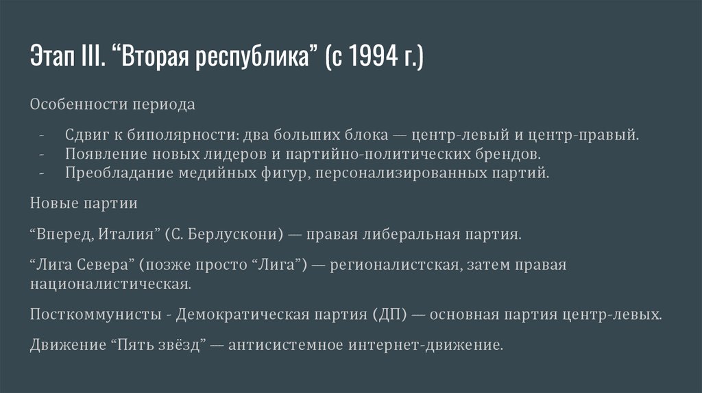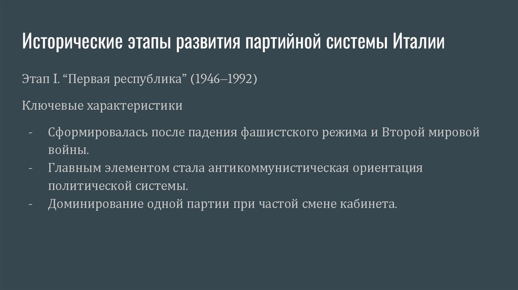 Исторические этапы развития партийной системы ИталииЭтап I. “Первая республика” (1946–1992)