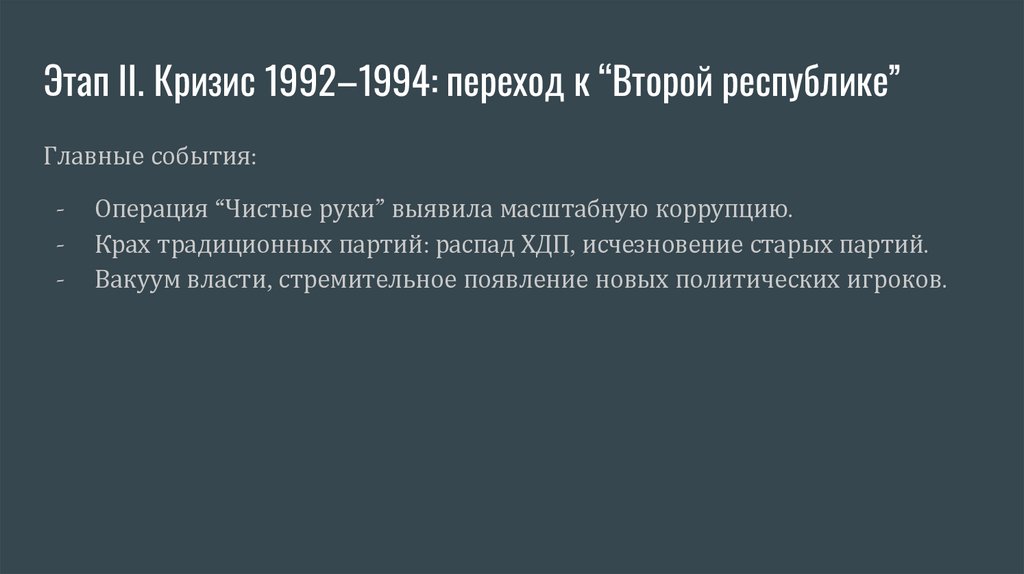 Этап II. Кризис 1992–1994: переход к “Второй республике”Главные события: