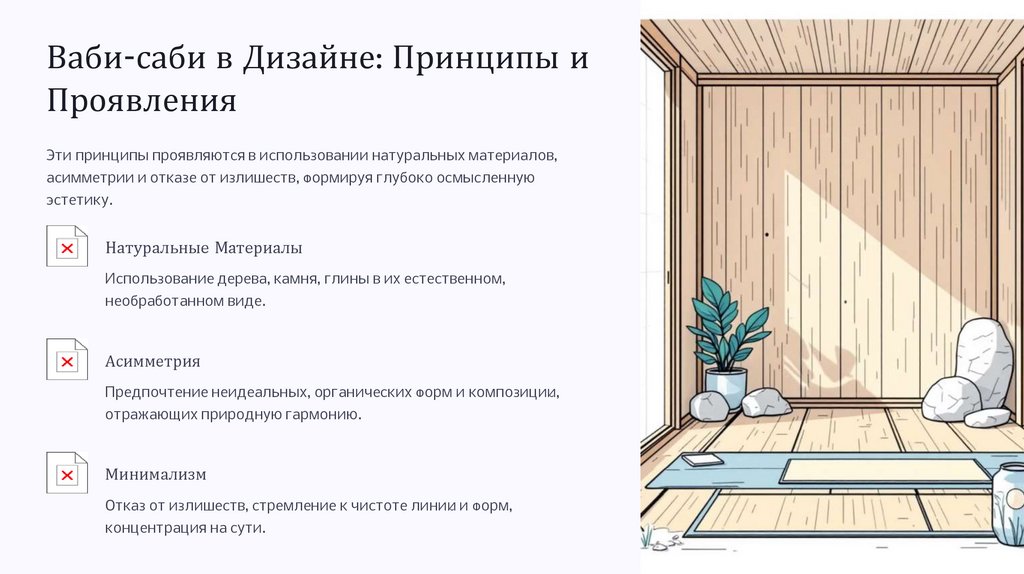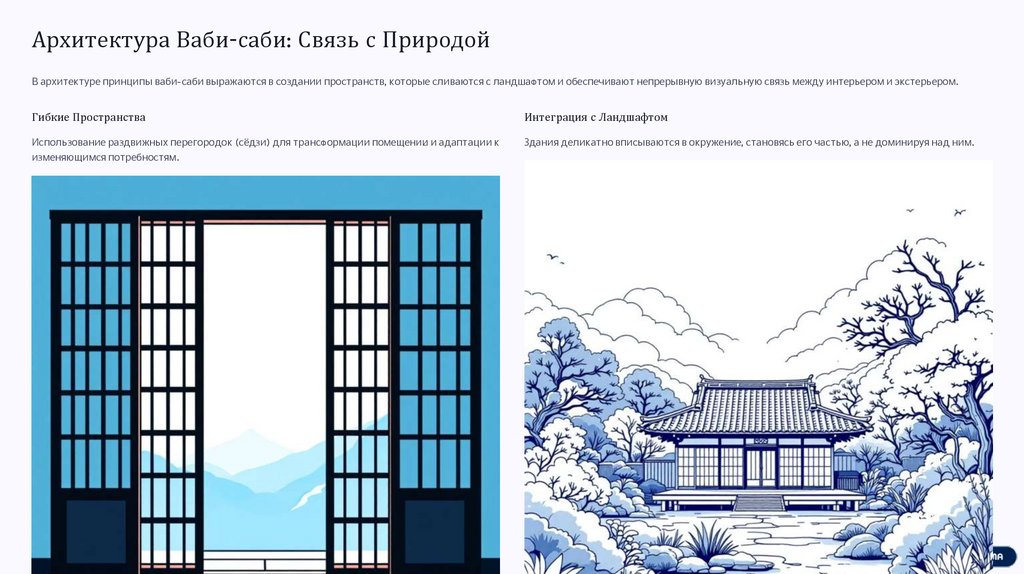 Архитектура Ваби-саби: Связь с ПриродойВ архитектуре принципы ваби-саби выражаются в создании пространств, которые сливаются с ландшафтом и обеспечивают непрерывную визуальную связь между интерьером и экстерьером.