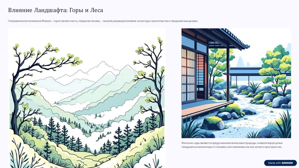 Влияние Ландшафта: Горы и ЛесаГеографическое положение Японии — гористая местность, покрытая лесами, — оказало решающее влияние на методы строительства и ландшафтный дизайн.