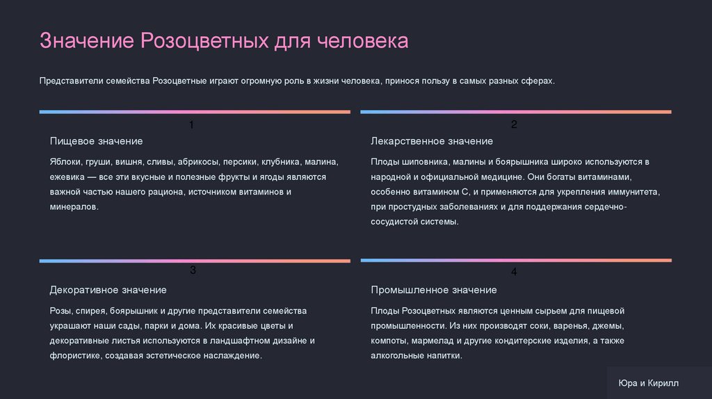 Значение Розоцветных для человекаПредставители семейства Розоцветные играют огромную роль в жизни человека, принося пользу в самых разных сферах.