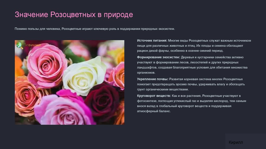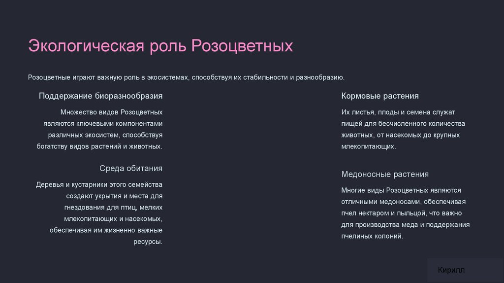 Экологическая роль РозоцветныхРозоцветные играют важную роль в экосистемах, способствуя их стабильности и разнообразию.